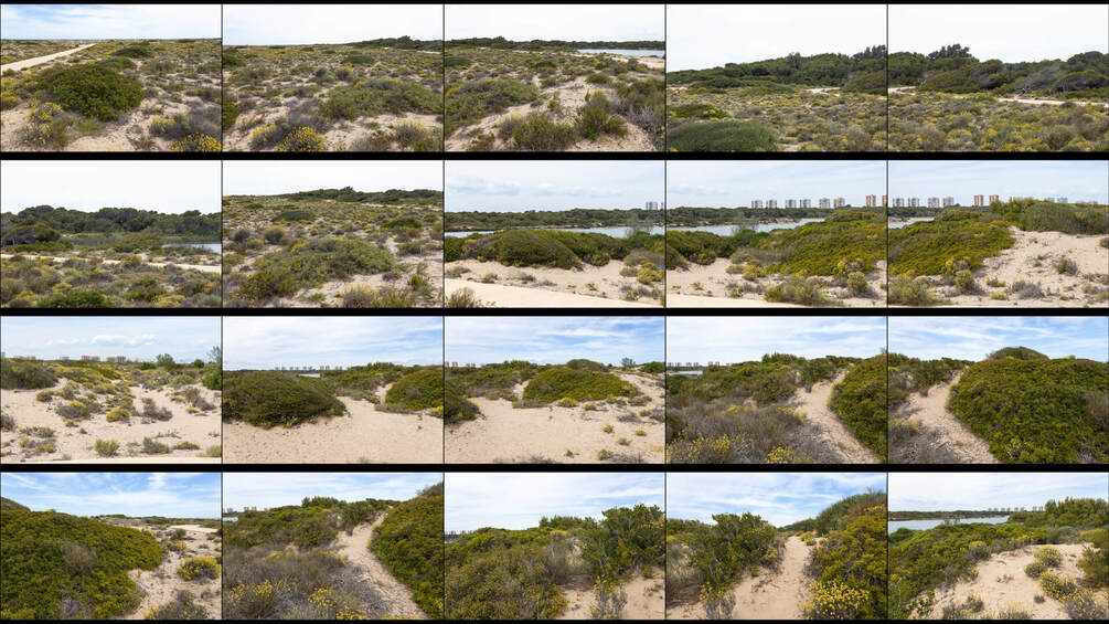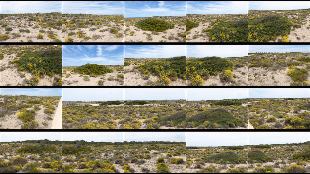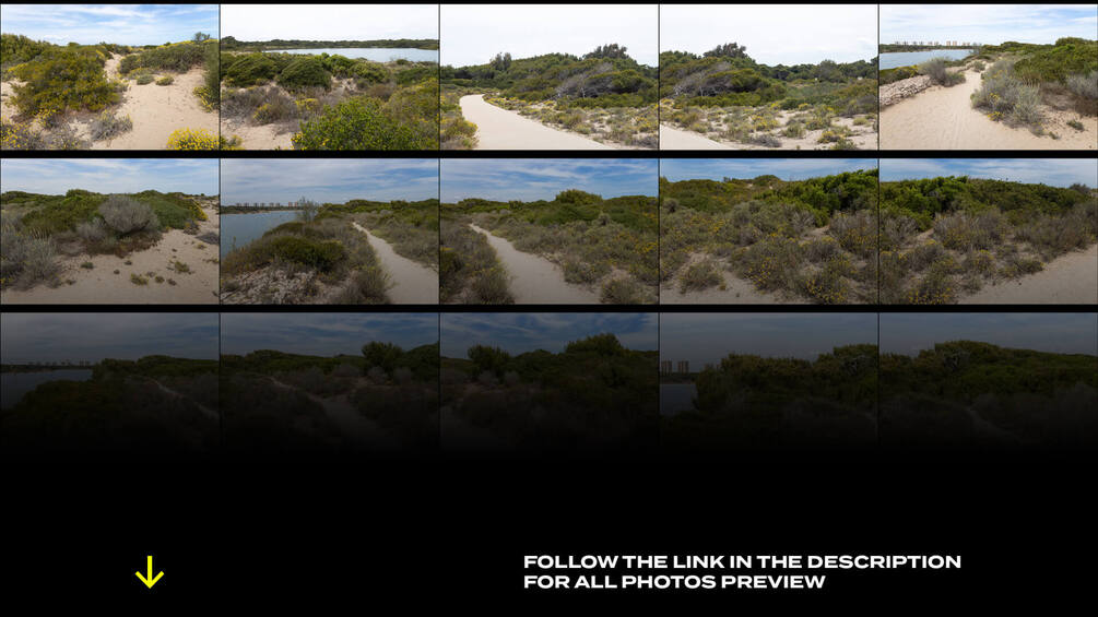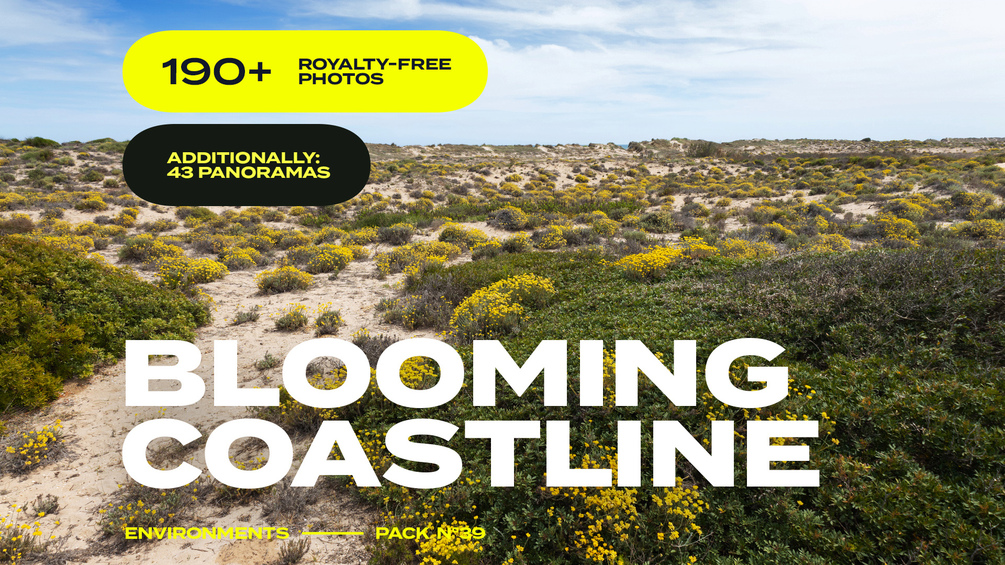 This pack features photo references of a sandy beach covered with yellow flowers and bushes growing in the constant winds.